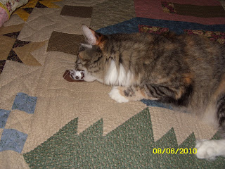 So now my blog will also have the antics of a little bitty dog. We have never had a dog this small, and no puppy for more than 15 years. I am thinking puppies are harder to raise than kittens, but we love him anyway. Now if Callie and Aeris will just accept him, my world will be right again. I have not had much computer time and very little quilting time this week. I am working with him. I put him on his leash and take him with me wherever I go. Today we picked green beans, tomatoes, and zucchini. He likes it outside, but was ready to go into the house when we got done. I don't blame him. I was pretty hot too. (grin)